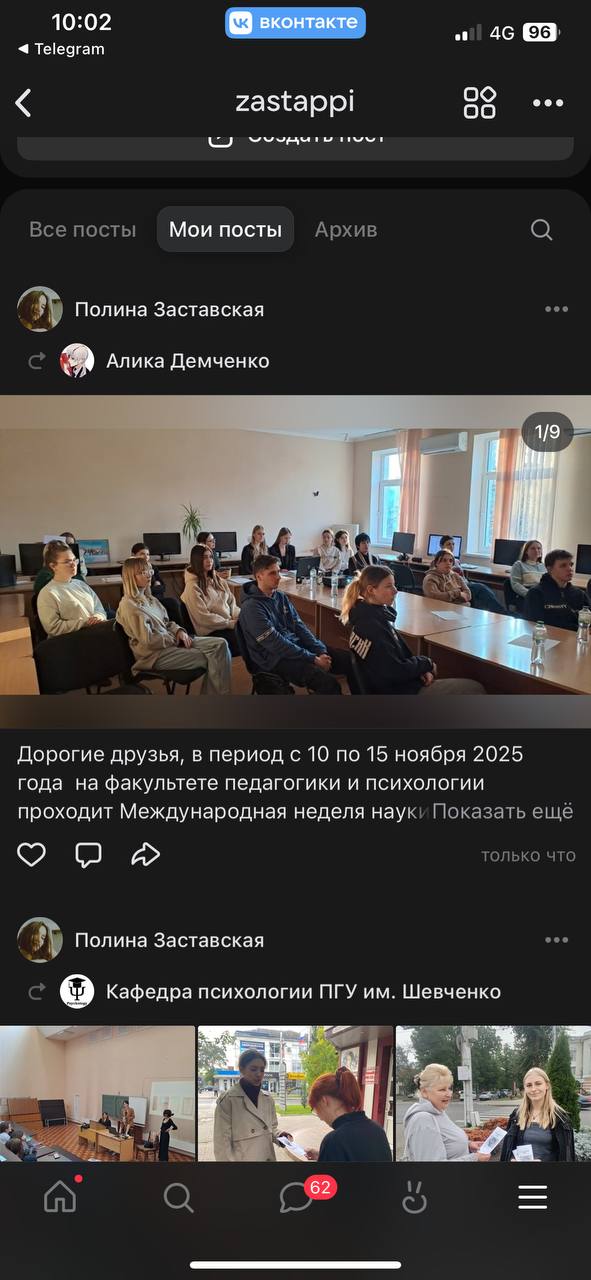 В своем посте члены СНО рассказали о широте научных исследований: «Психосоматические аспекты онкологических состояний», «Горячая линия как средство психологической поддержки для онкобольных», «Психологический возраст и личностная зрелость: точки разрыва и сближения», «Возможности диагностики психологического возраста личностной зрелости», «Психолог в роли HR: анализ практического опыта» и пр. Ребята поделились информацией о проводимых научным обществом мероприятиях: международном дне психического здоровья, мастер-классах, заседаниях секции «Психология» студенческой научной конференции, профориентационной работе, плановых заседаниях и др.