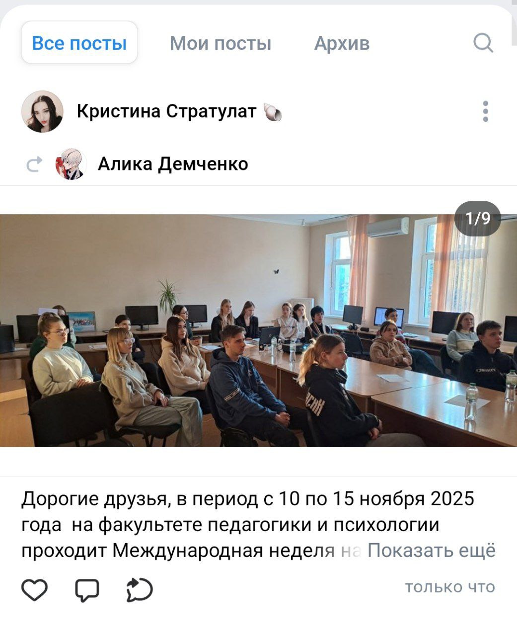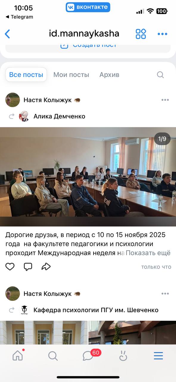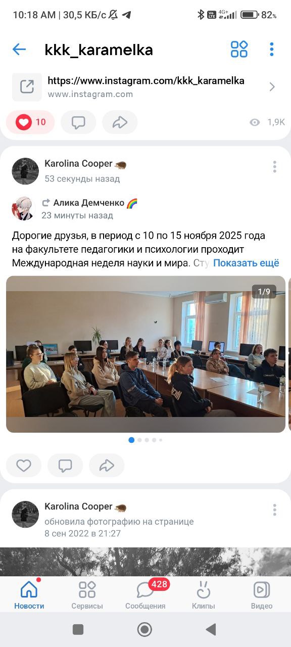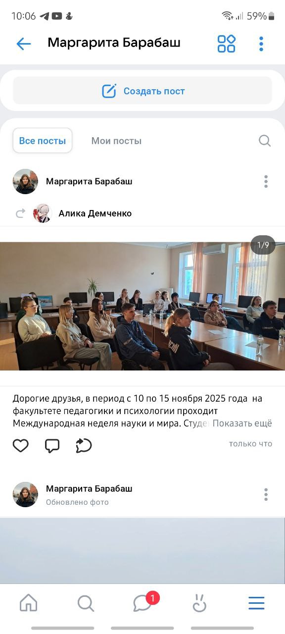 10 ноября в 10.00 члены СНО «Психолог разместили в социальной сети «Вконтакте» информационные посты и фотографии, посвященные психологической науке, рассказали о результатах своей работы за прошедшее время. Этот пост активно просматривали пользователи социальной сети и подписчики страницы кафедры психологии.