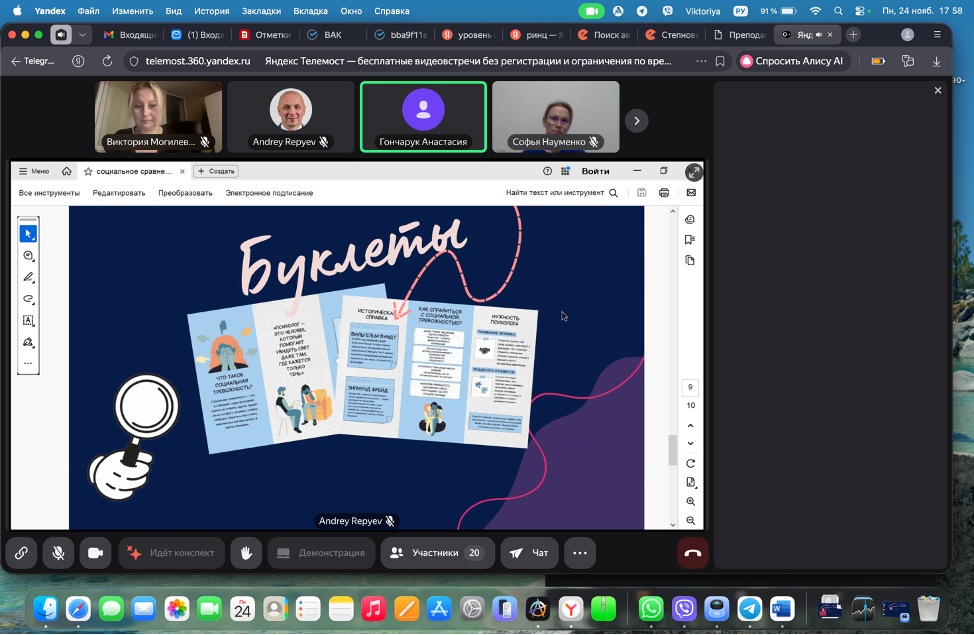 - Доклад «Исследование феномена социального сравнения в ракурсе тревожности личности» (бакалавр 1 курса Гончарук А. П научный руководитель ст. преподаватель Могилевская В.Ю., ГОУ ВО «Приднестровский государственный университет»). Анастасия поделилась результатами проведенного ею исследования феномена социального сравнения и влияния социальной тревожности на личность человека. Докладчик показала практическую ориентированность исследования и презентовала разработанные по его итогам просветительские буклеты, посвящённые изученной проблеме.