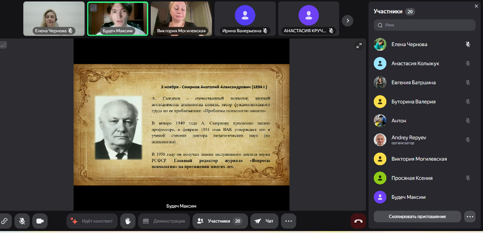 - Выступление «Психологический календарь ноября» (бакалавр 1 курса, профиля «Прикладная психология» Будеч М., научный руководитель ст. преподаватель Чернова Е.Н., ГОУ ВО «Приднестровский государственный университет»). Максим напомнил наиболее значимые даты ноября для психологии как науки, рассказал о днях рождения ученых-психологов, отмечающими личный праздник в этот месяц.