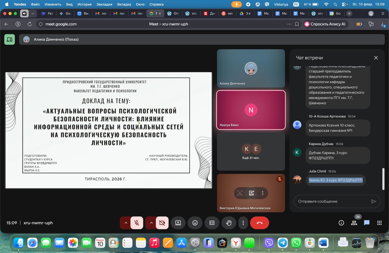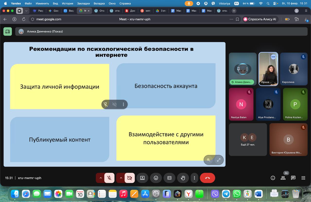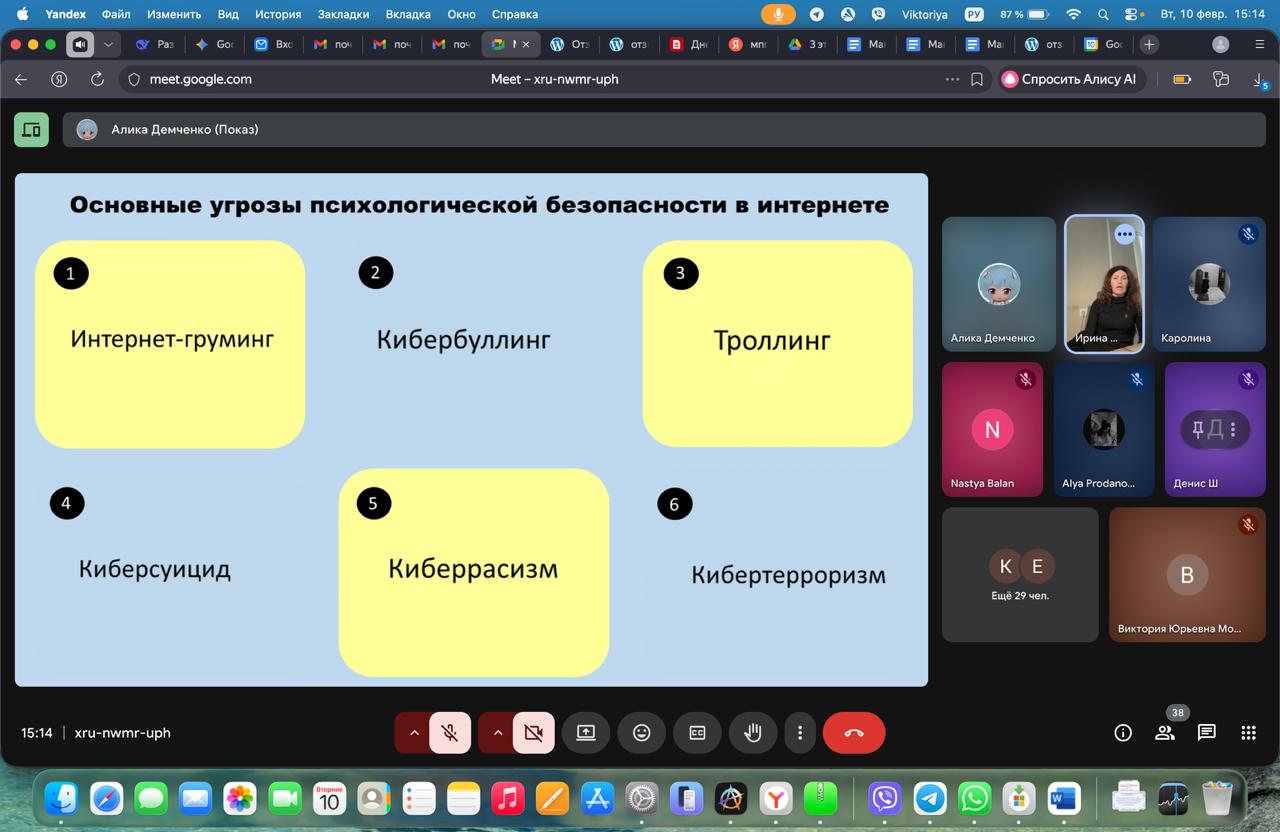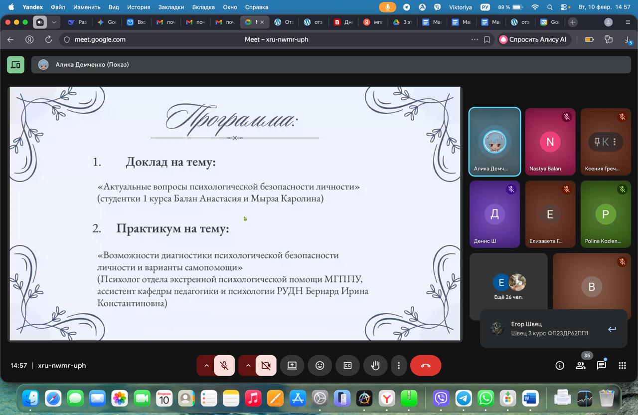 Анастасия Балан и Мырза Каролина представили доклад на тему: «Актуальные вопросы психологической безопасности личности». Студентки I курса рассказали о результатах проведенного ими исследования. Они показали, что у студентов в достаточной степени выражена психологическая потребность в безопасности и они сталкиваются в информационными угрозами ее нарушения. Анастасия и Каролина так же презентовали просветительский буклет, разработанный по материалам исследования, куда включили информацию о понятии и структуре психологической безопасности, перечень научно-популярной литературы и художественных фильмов посвященных этой проблеме. Приглашенный гость, психолог отдела экстренной психологической помощи МГППУ, ассистент кафедры педагогики и психологии РУДН И.К. Бернад провела практикум «Возможности диагностики психологической безопасности личности и варианты самопомощи». Ирина Константиновна рассказала о психологической безопасности в информационном пространстве, проанализировала практическую кейс-задачу, рассказала об экстренной психологической помощи на горячей линии по таким вопросам и предложила практические рекомендации о том, как сохранить психологическую безопасность и бороться с угрозами ее нарушения.